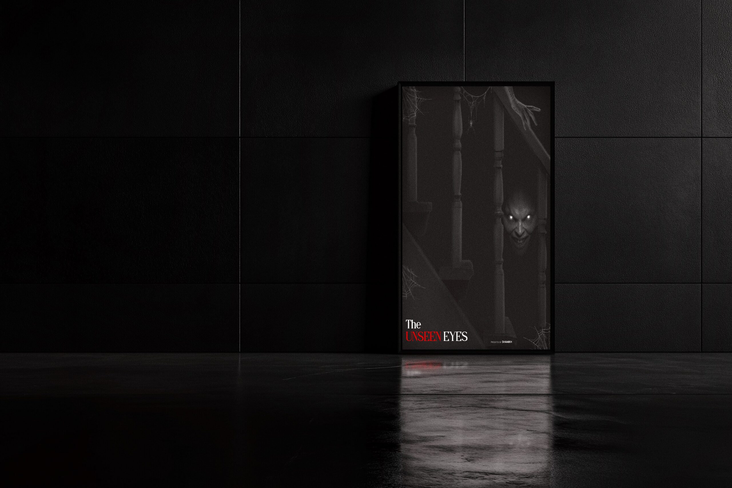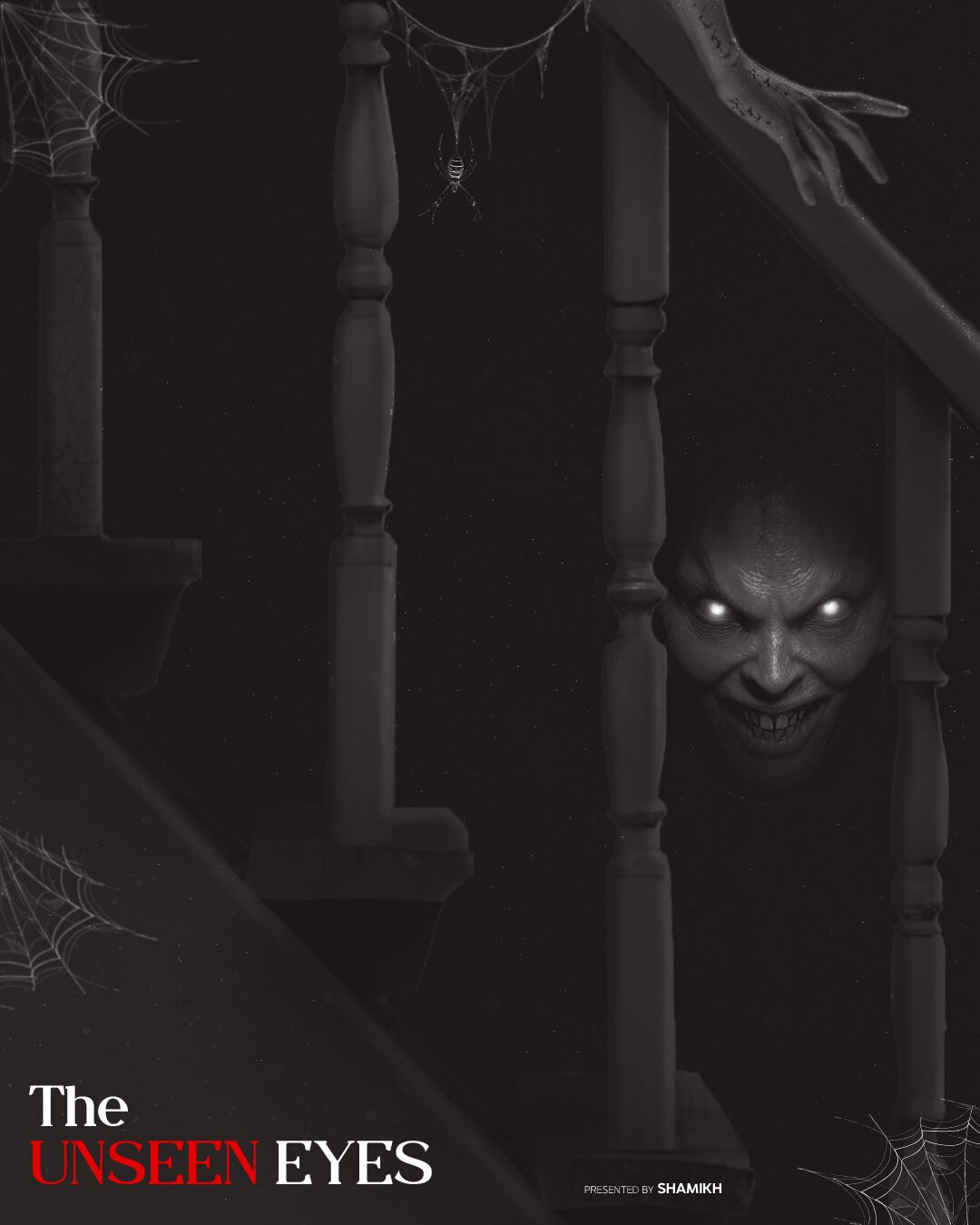 The Unseen Eyes” is a conceptual horror poster born entirely from my imagination, designed to explore the subtle terror of what we cannot fully see. The staircase in the composition symbolizes familiarity and safety, yet the darkness between its rails conceals an ancient, watchful presence. The glowing eyes hint at an intelligence lurking in the shadows — they aren’t chasing you; they are already observing every move you make.
